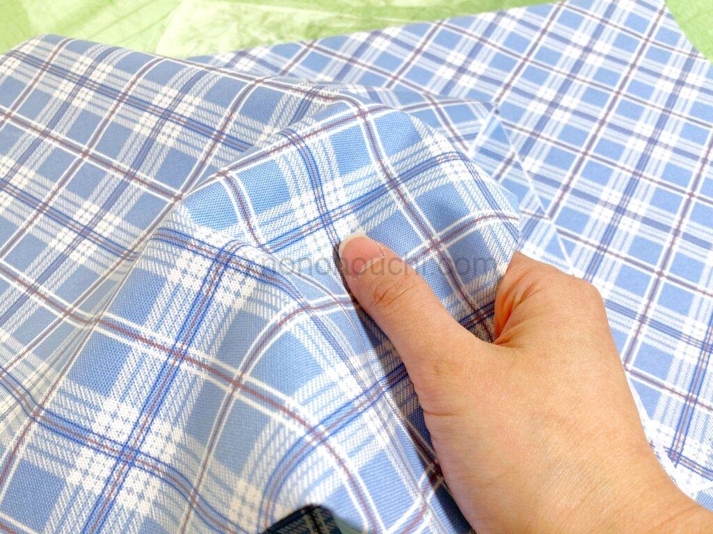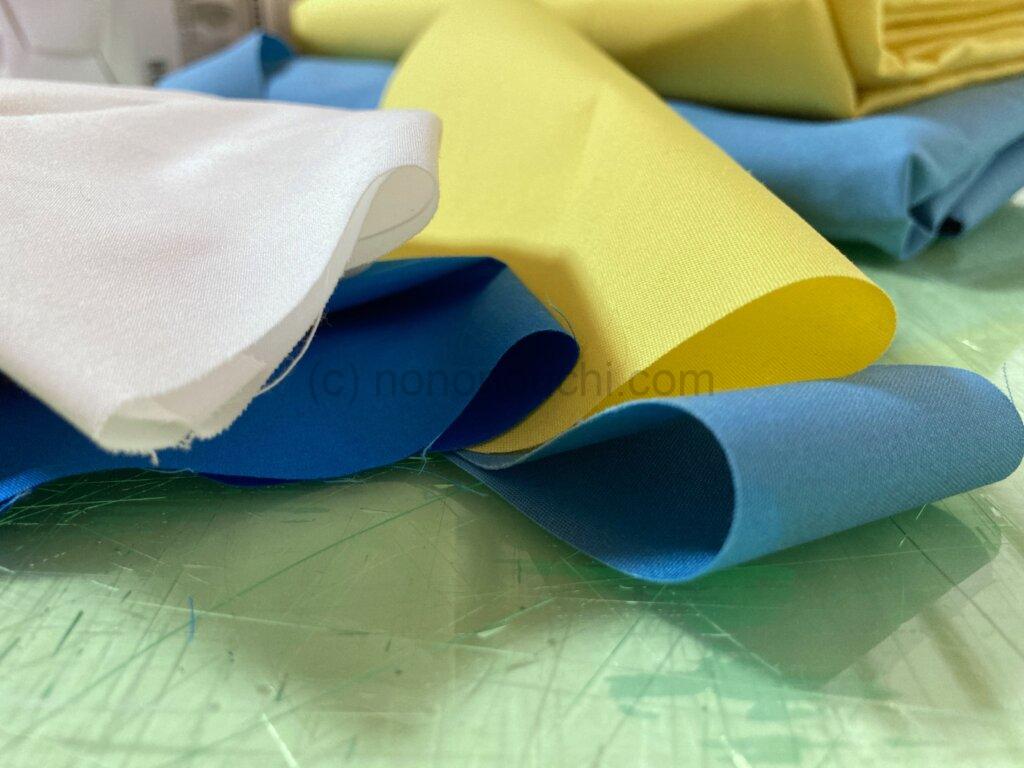 水色が思ったより濃いめの印象。水色と黄色の生地は、やや厚めでハリのある生地でした。