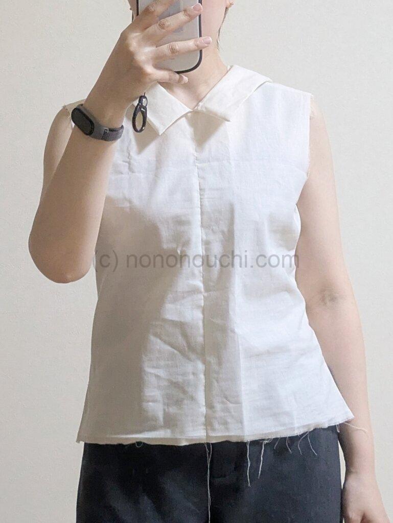白地でコットン入りのハーフリネンを選びました。完成するとなんだか「お仕事着?」という雰囲気に。合わせた綿レースとの微妙な色差も悪かったかも、、、