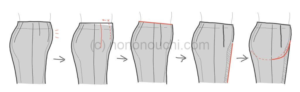 以前ご紹介した「体型に合わせたパンツのパターン作成方法」をベースに、今回はお腹まわりの補正を加えました。