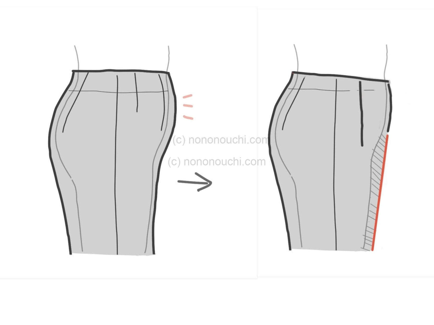 以前ご紹介した「体型に合わせたパンツのパターン作成方法」をベースに、今回はお腹まわりの補正を加えました。