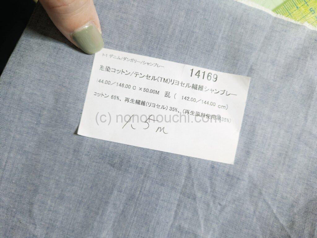 使用したのは、ソールパーノの1.5mバラエティセットに入っていた、14169 先染コットン/テンセル(TM)リヨセル繊維シャンブレー。