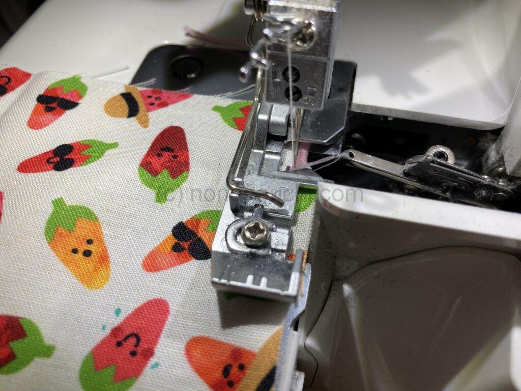 ②布を押さえの右端ぴったりに合わせる(布端5mmくらいが巻かれます)