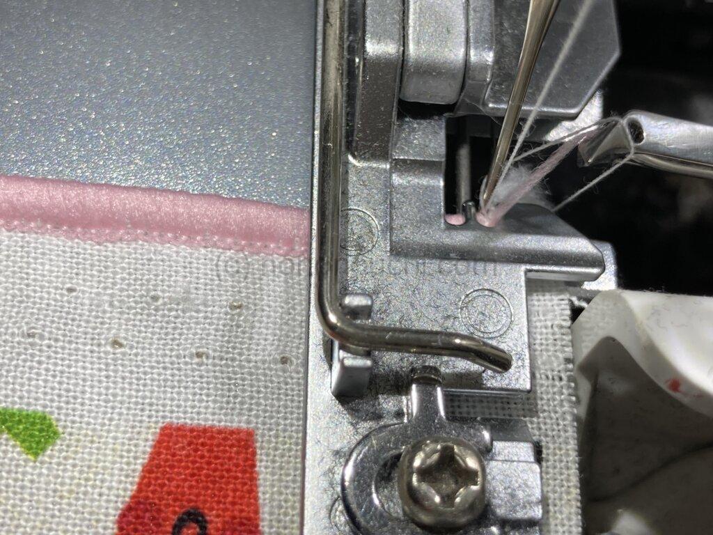 ⑦ぐるっと回って一番最後、一番初めの空環が戻って来るので、メス有りにし、初めの空環をメスでカットしながら、最後まで縫いきる