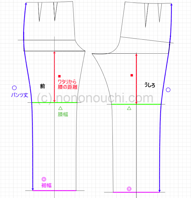 △膝幅・・・手持ち服を参考に(前22cm,後ろ24cm)