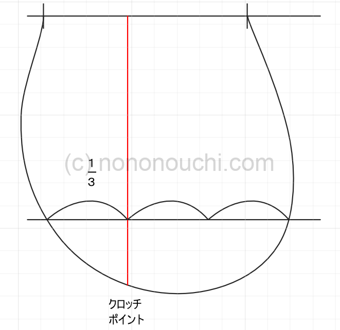 4.自在曲線定規を股に当て、ウエストラインの前中心・後ろ中心位置に印をつける