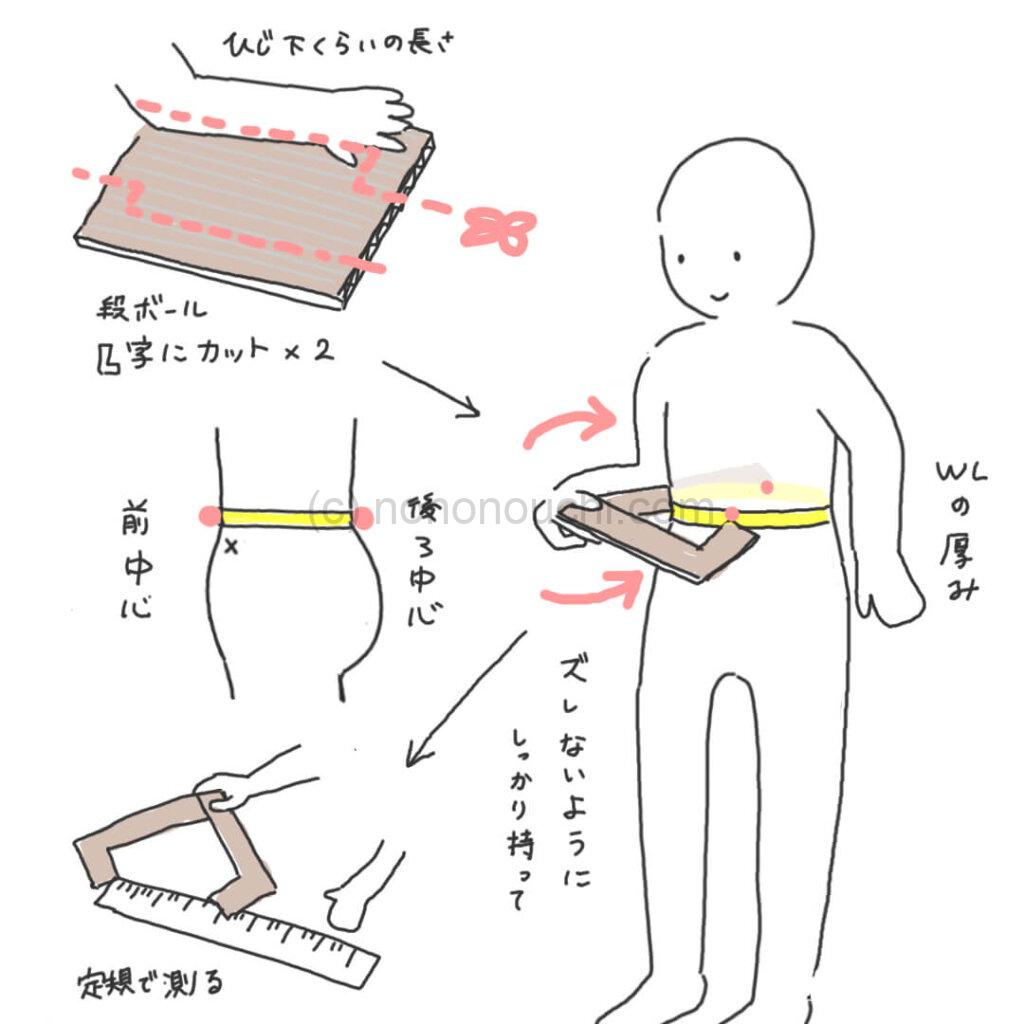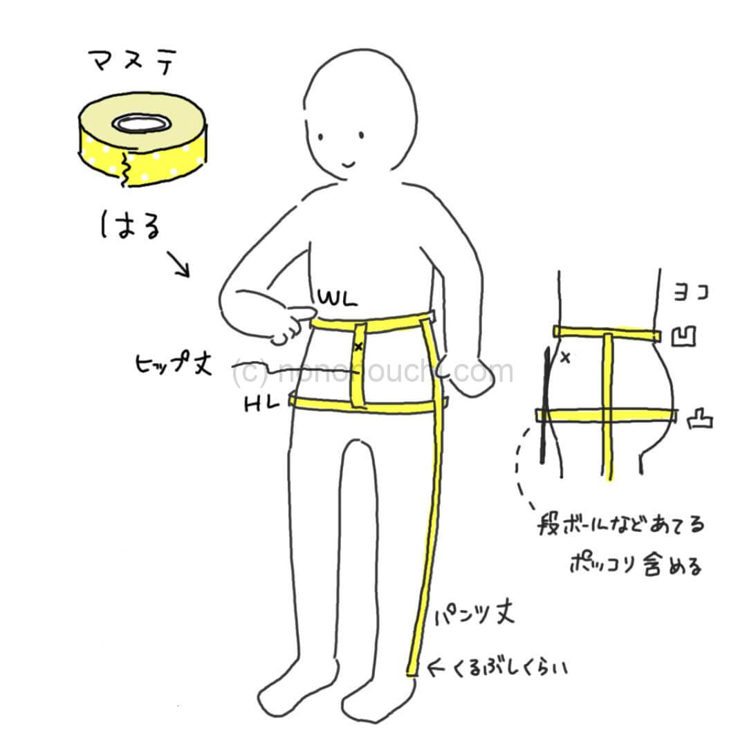 ※2025年1月追記:ウエストラインは、欲しいパンツのウエスト高さでテープを貼ります。手持ちのパンツなどを参考にしてください。