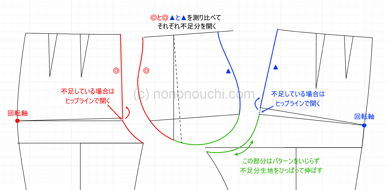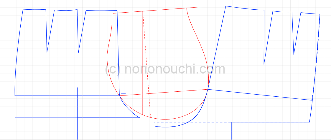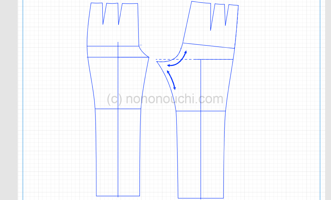 そこで、原型の股ぐりの長さと、股ぐりゲージの股ぐりの長さを比べて、不足分を開きました。