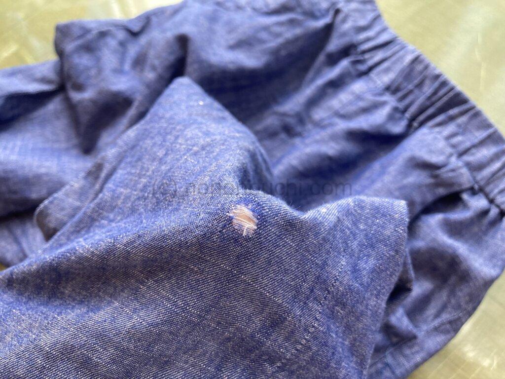 ↑こちらも、ほぼ同じ質感の別の生地ですが、別のお店で買った生地。この生地で作ったズボンも、春からヘビロテしていて、遂に穴が空きました。