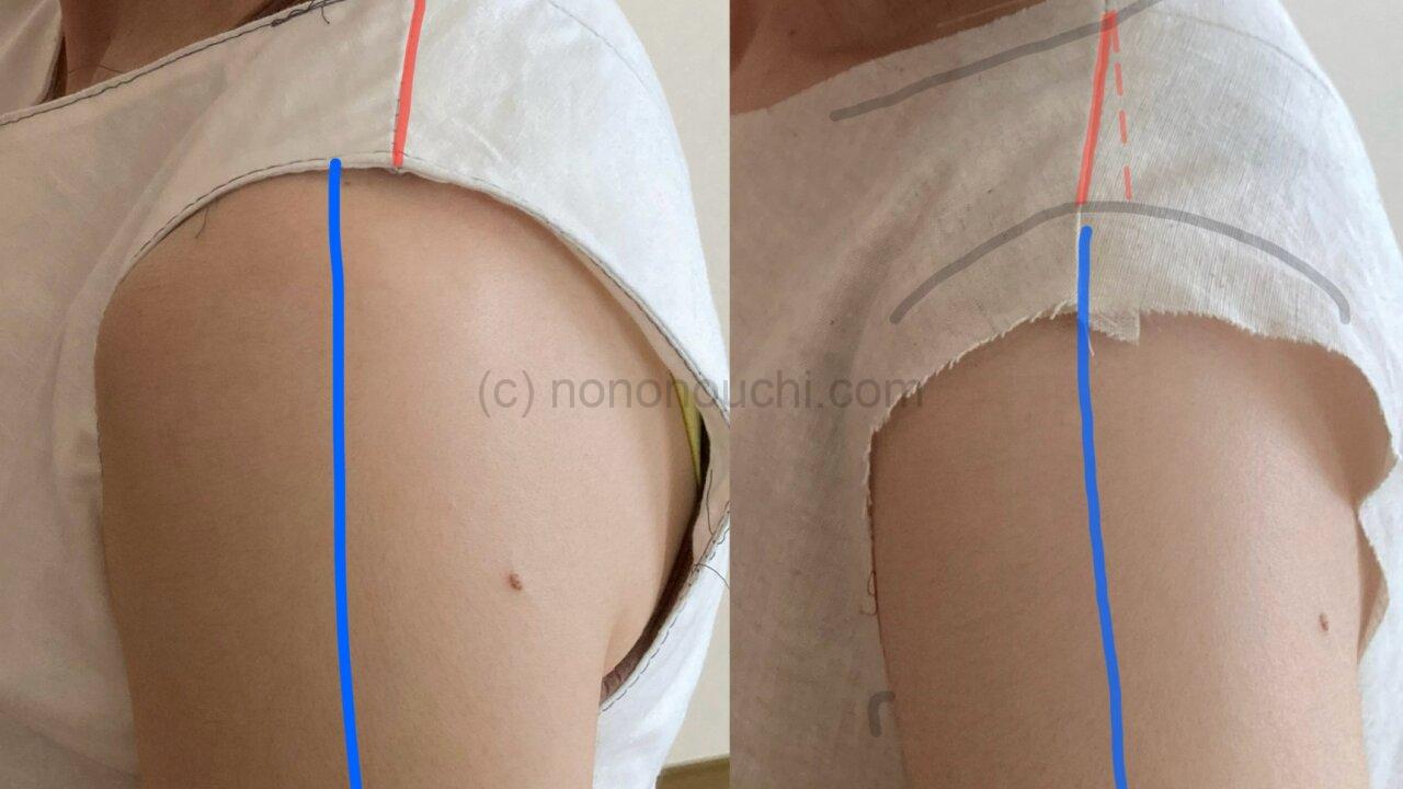 ネットで調べた方法を参考に、前見頃のショルダーポイントを低くし、後ろ見頃のショルダーポイントを伸ばすというパターン操作を行いました。