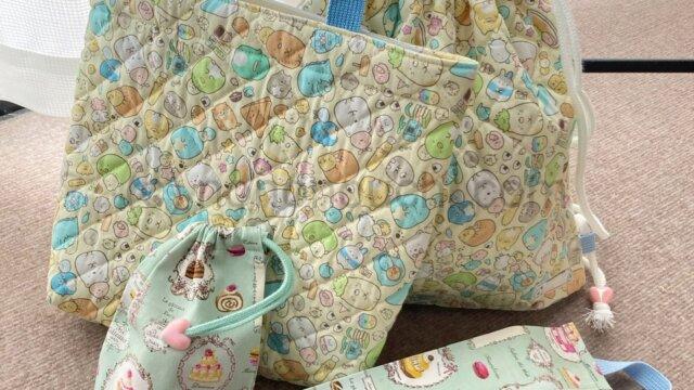 4月の小学校入学に向けて、体操服入れナップザック、絵本バッグ、歯ブラシコップ袋、ティッシュケースカバーを作りました。 2月に学校から、おおよそのサイズ指定が …
